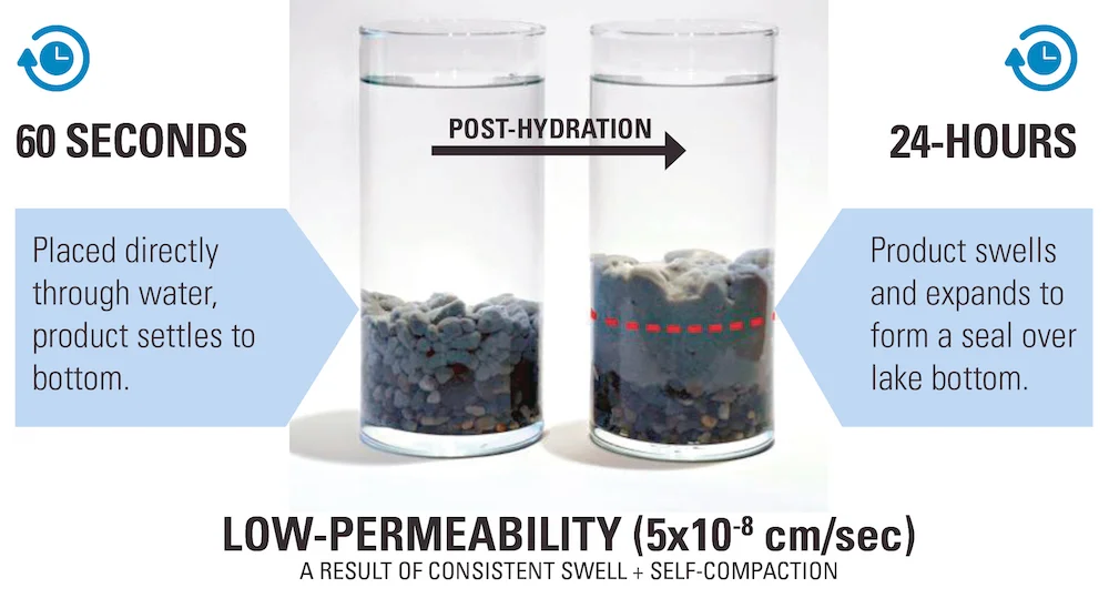 Over time (hours), you will note that the bentonite has expanded and filled the voids between the aggregate. This process allows AquaBlok to self-compact, eliminating the need for mechanical compaction to achieve a low-permeability seal.